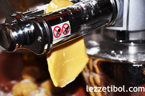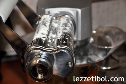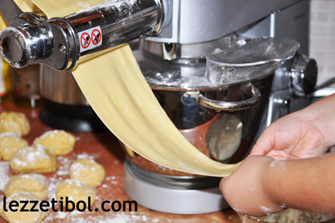 Daha sonra hamur karıştırıcı aparatı takarak üzerine 5 su bardağı un ekleyin ve kulak memesi yumuşaklığından biraz daha sert bir hamur olana kadar mutfak şefini çalıştırın. Tahmini olarak 2-3 dk yeterli olur. Üzerini kağıt havlu örterek 30 dk dinlendirin. Kenwood mutfak şefine makarna yapıcısı aparatını takın. Hamurdan 12 adet beze yapın. Makarna yapıcısı aparatını hafif unlayın.